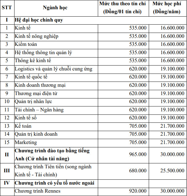 – (**) Chương trình tiên tiến: Song ngành Kinh tế – Tài chính: đào tạo bằng tiếng Anh, sử dụng chương trình đào tạo nhập khẩu từ trường Đại học Sydney, Úc.