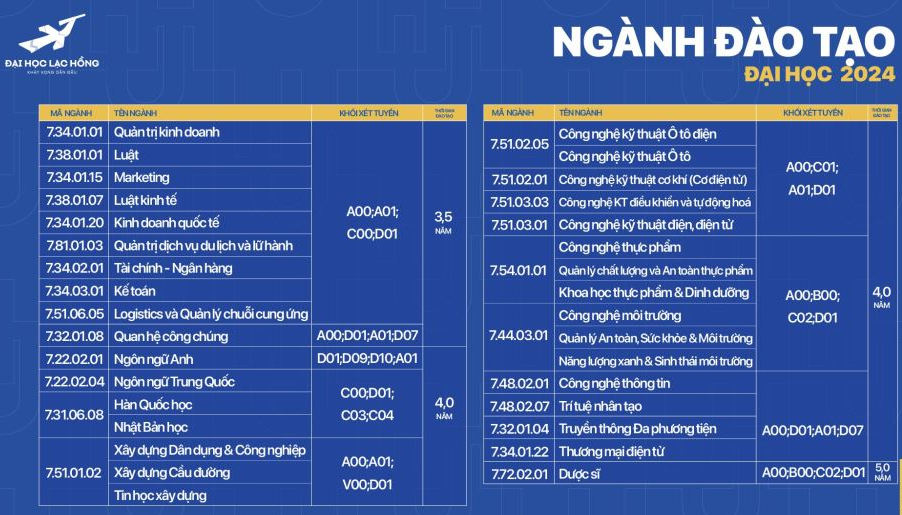 Năm 2024, Trường Đại học Lạc Hồng thông báo tuyển sinh 24 ngành với 33 chuyên ngành hệ đại học chính quy