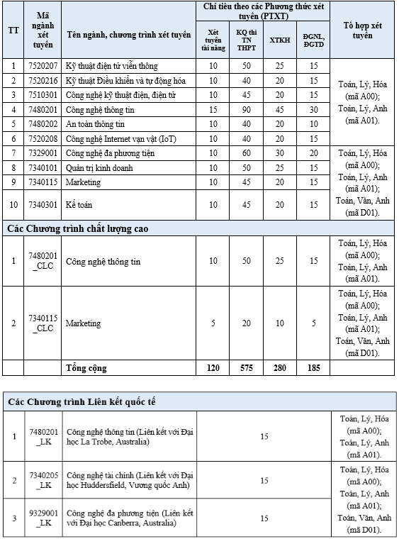 - Thí sinh đoạt giải Khuyến khích trong kỳ thi chọn học sinh giỏi quốc gia hoặc đã tham gia kỳ thi chọn học sinh giỏi quốc gia hoặc đoạt giải Nhất, Nhì, Ba, Khuyến khích trong kỳ thi chọn học sinh giỏi cấp Tỉnh, Thành phố trực thuộc Trung ương (TW) các môn Toán, Lý, Hóa, Tin học và có kết quả điểm trung bình chung học tập lớp 10, 11, 12 hoặc học kỳ 1 lớp 12 (nếu chưa có kết quả năm học lớp 12) đạt từ 7,5 trở lên và có hạnh kiểm Khá trở lên;