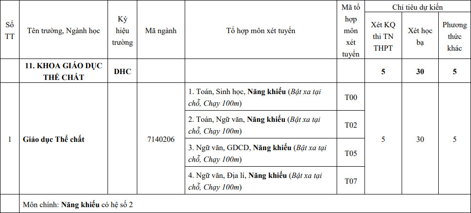 Khoa Giáo dục Thể chất xét tuyển sử dụng điểm học bạ hoặc điểm thi TN THPT kết hợp với điểm thi năng khiếu cho ngành Giáo dục Thể chất.