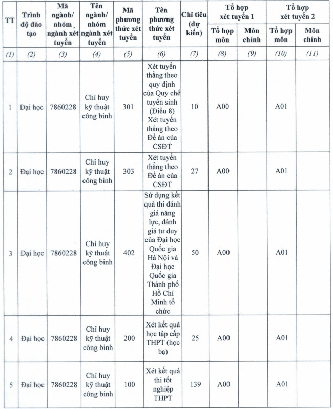 - Thí sinh tốt nghiệp THPT năm 2024 được ưu tiên xét tuyển vào Trường Sĩ quan Công binh theo môn (hoặc lĩnh vực) Toán đoạt giải khuyến khích (hoặc giải tư) trong kỳ thi chọn học sinh giỏi quốc gia, quốc tế hoặc thi khoa học, kỹ thuật cấp quốc gia, quốc tế do Bộ GD&ĐT tổ chức, cử tham gia; thời gian đoạt giải không quá 3 năm tính tới thời điểm xét tuyển.